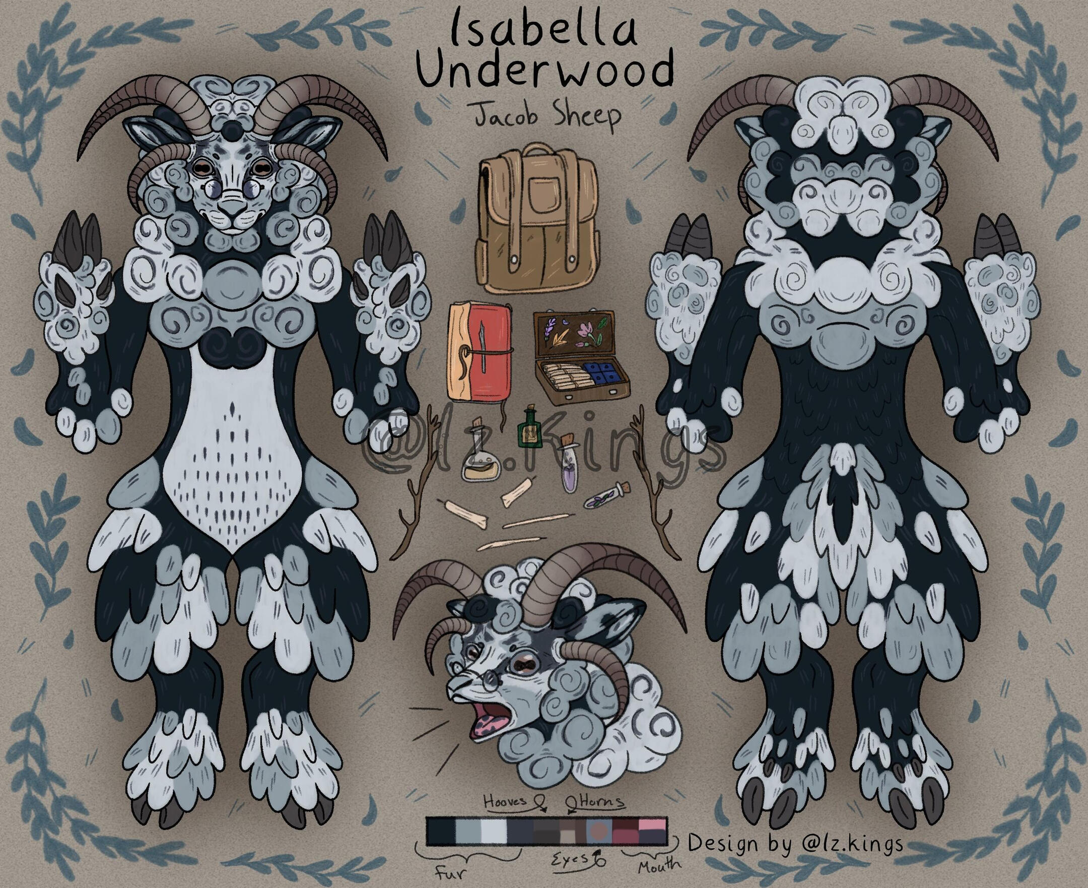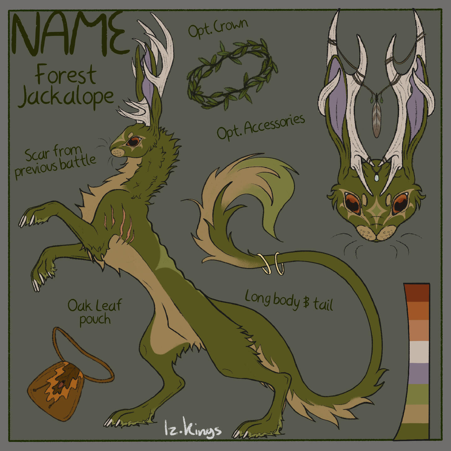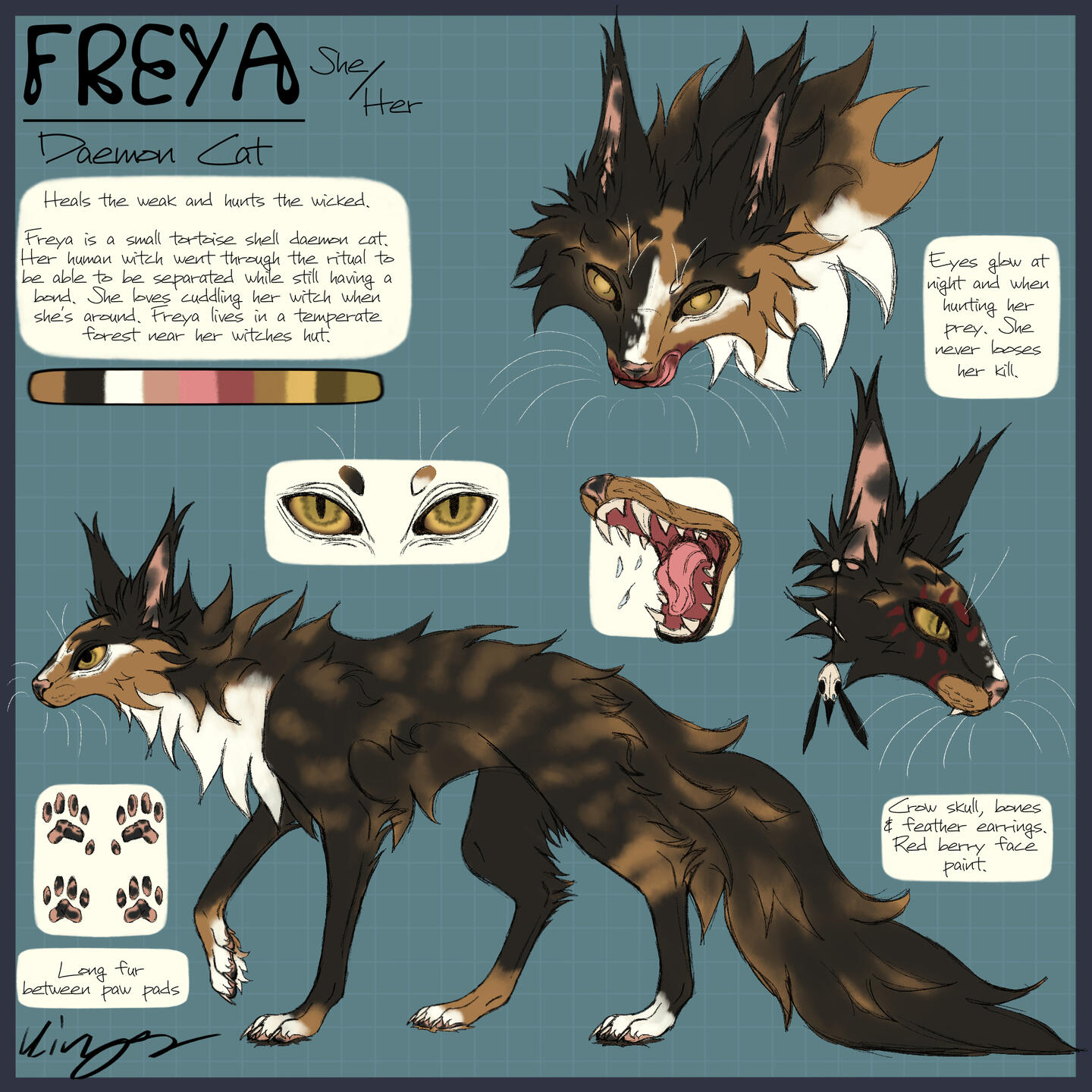 Flat color, includes: full-body, headshot, 2 closeups or accessories, color palette, name, and info on a simple background.