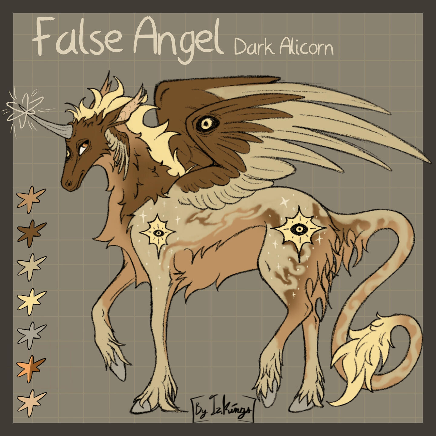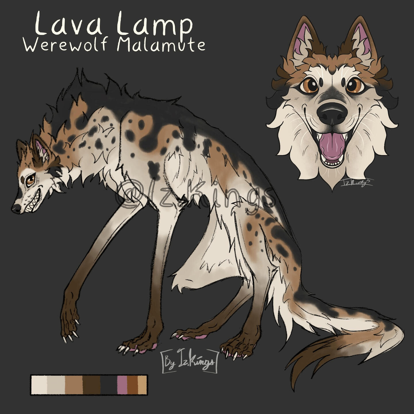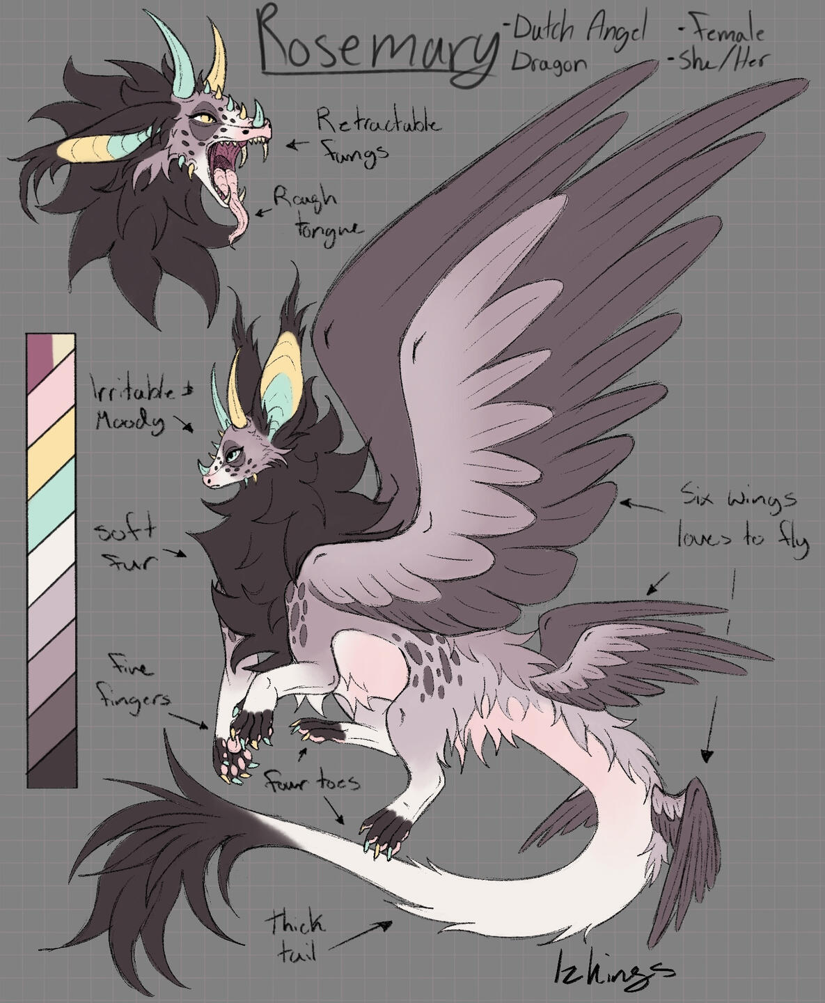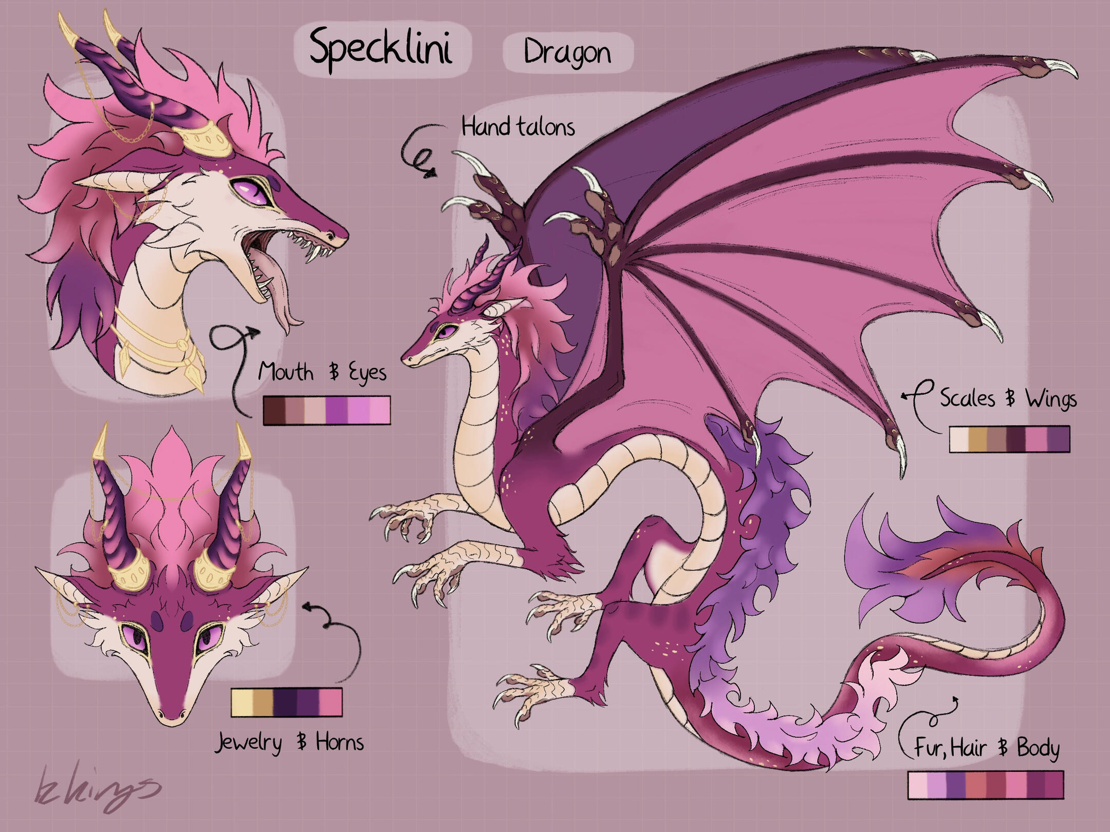 Flat color, includes: full-body, headshot, 2 closeups or accessories, color palette, name, and info on a simple background.